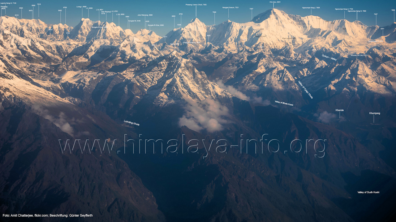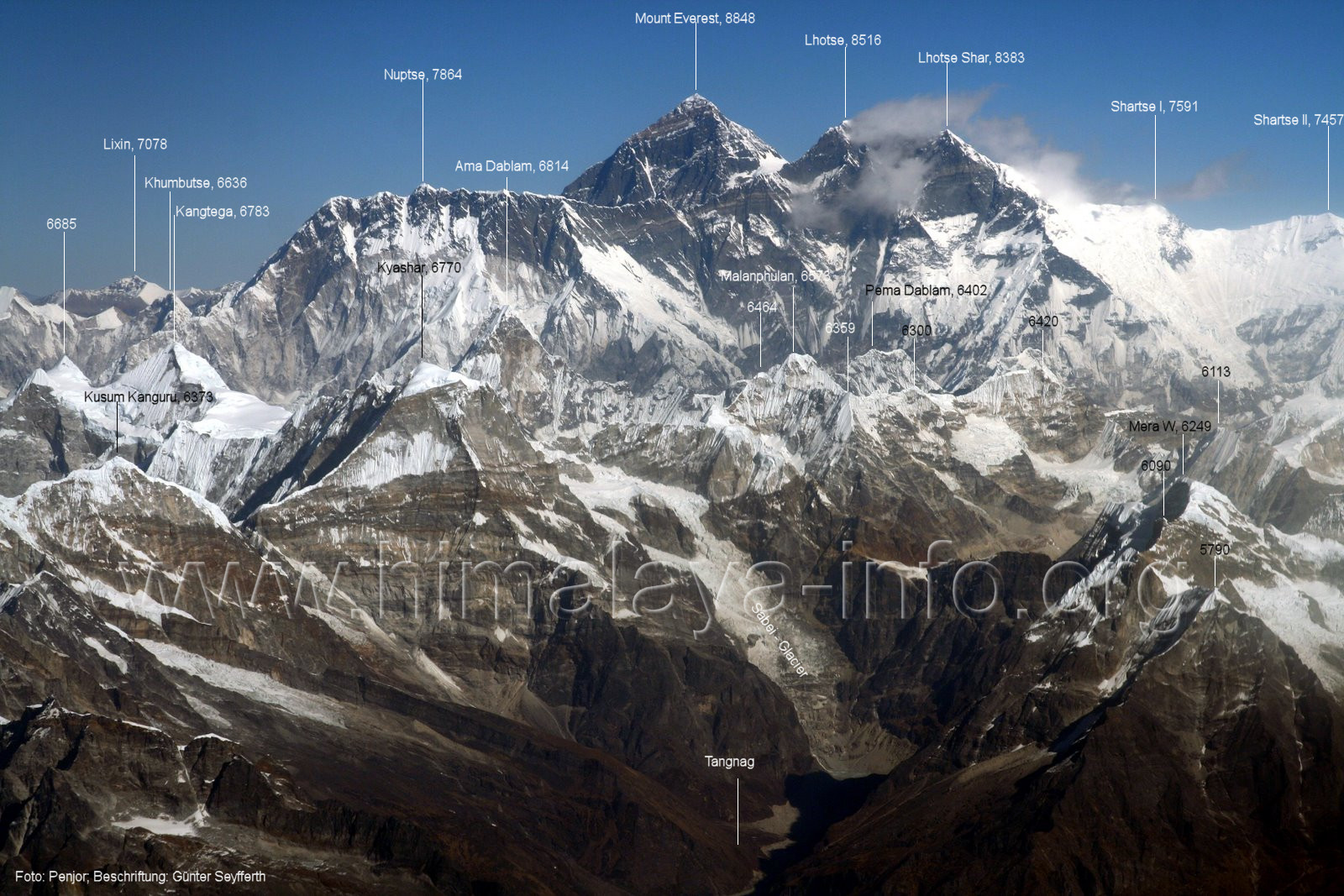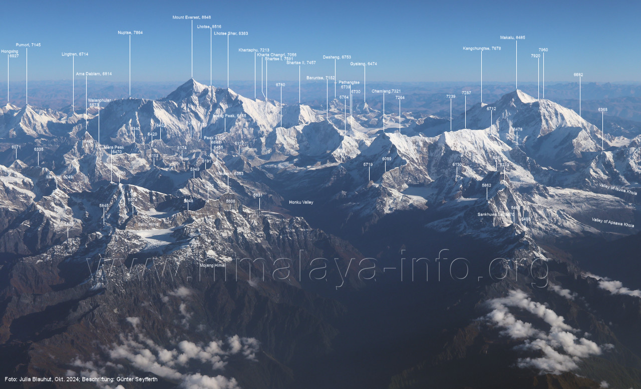 Mera Peak. Foto: Roger Nix, flickr.com; Beschriftung: Günter Seyfferth (121a) Blick von Süd-Südwesten zu Mount Everest (8848 ) und Makalu (8485 m) Dieses Foto ist einer der besten Übersichten über die mittlere und östlichen Khumbu-Region. Foto: Julia Blauhut, Okt. 2024; Beschriftung: Günter Seyfferth (122) Makalu (8485 m) und Chamlang (7321 m) von Südwesten Die Gipfel rechts unten stehen am Ostrand des Honku-Tales. Foto: Roger Nix, flickr.com; Beschriftung: Günter Seyfferth (123) Makalu (8485 m) und Chamlang (7321 m) von Süd-Südwesten Die Gipfel am rechten Bildrand stehen südlich und nördlich des Barun-Tals. Foto: Roger Nix, flickr.com; Beschriftung: Günter Seyfferth (124) Gyachung Kang (7952 m), Ama Dablam (6814 m), Pumori (7145 m), Nuptse (7864 m), Mount Everest (8848 m) und Lhotse (8516 m) von Süden