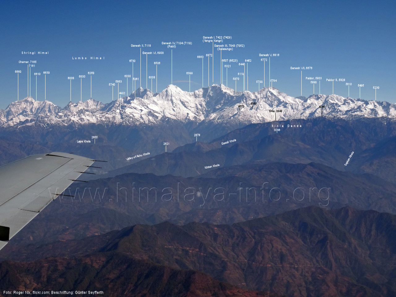 II. Foto: Roger Nix, flickr.com; Beschriftung: Günter Seyfferth Das folgende Foto zeigt den mittleren Bereich mit den hohen Gipfeln etwas vergrößert: (55) Ganesh Himal von Süden mit Ganesh II (7118 m), Ganesh IV (7104 m), Ganesh III (7043 m) und Ganesh V (6816 m) Foto: Roger Nix, flickr.com; Beschriftung: Günter Seyfferth