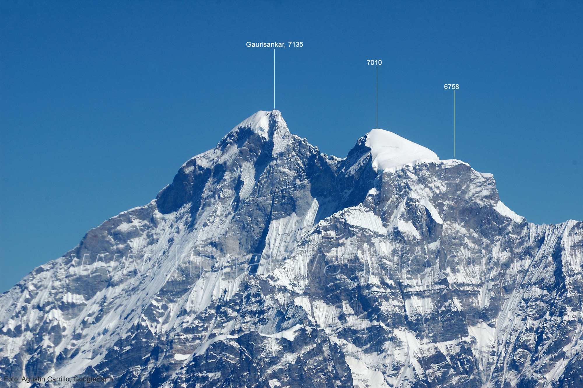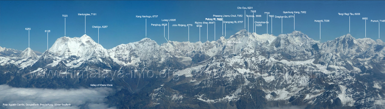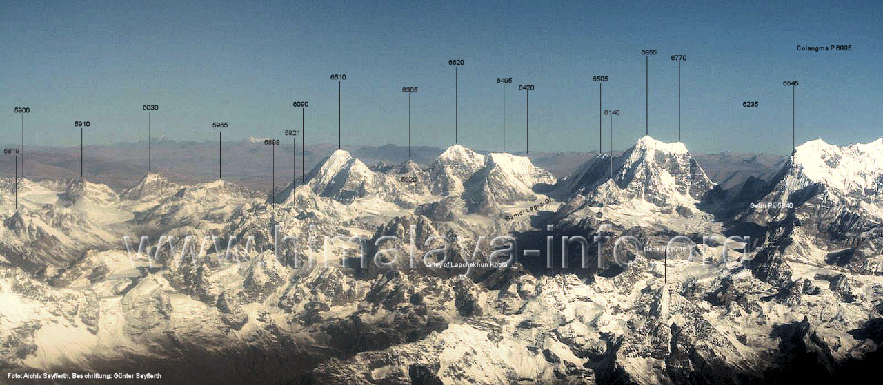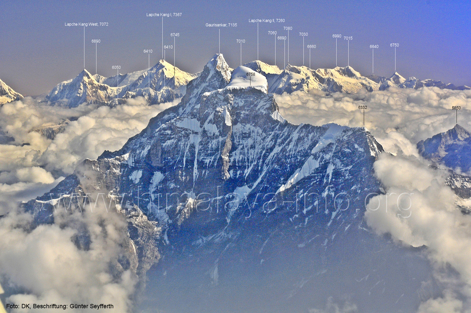 Die Tele-Aufnahme ist aus dem Bereich südlich des Gaurisankar gemacht. Foto unbekannt; Beschriftung: Günter Seyfferth Luftbilder des Lapche Himal und des Rolwaling Himal Die Beschreibung der Region von Lapche Himal und Rolwaling Himal finden Sie unter folgenden Links: