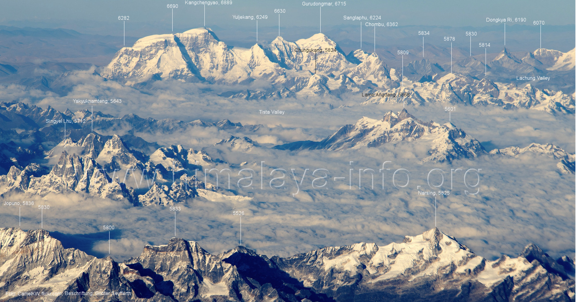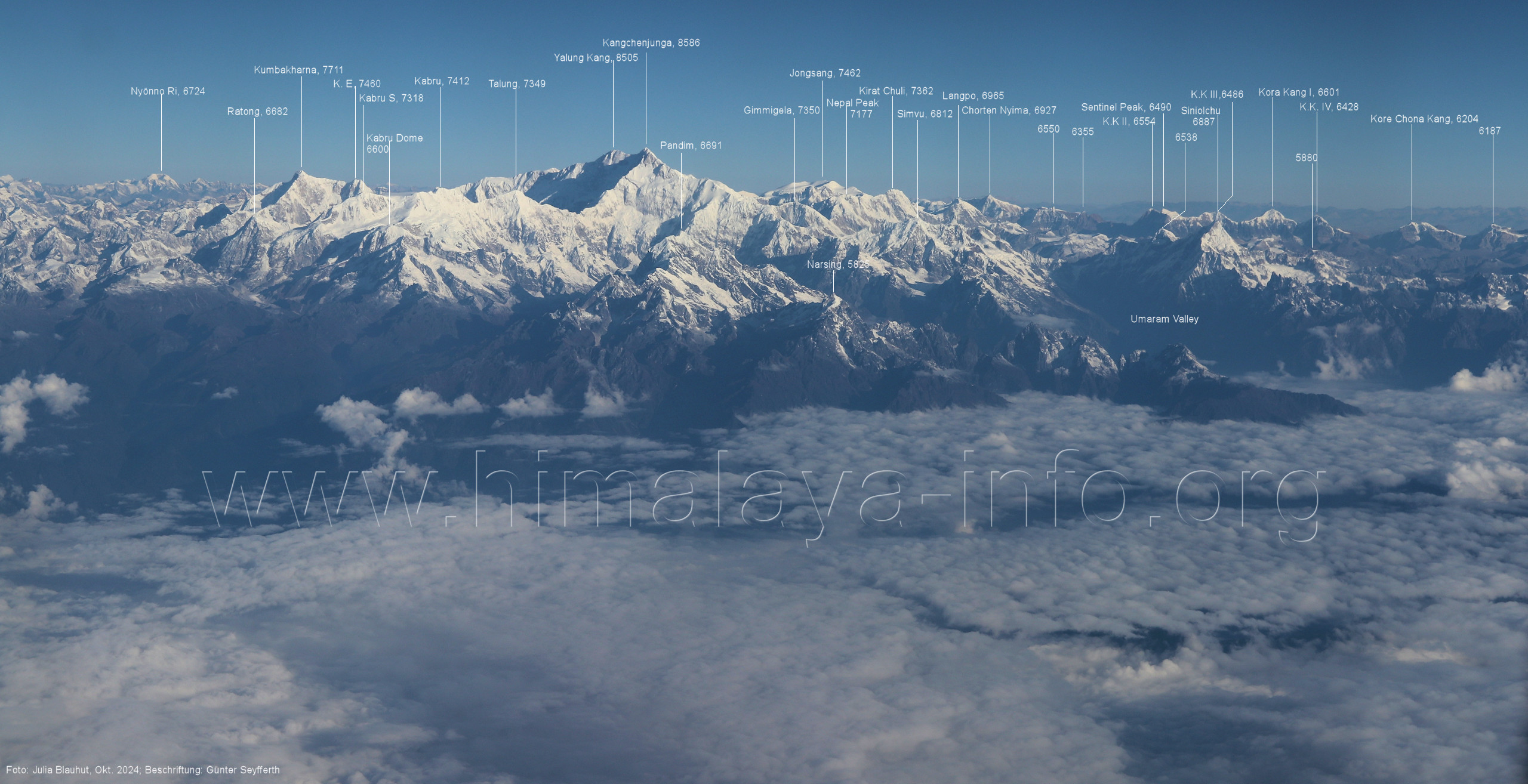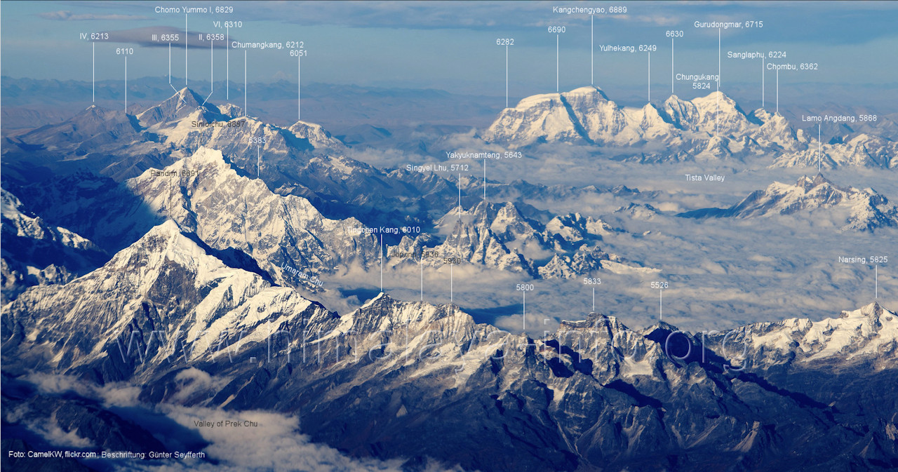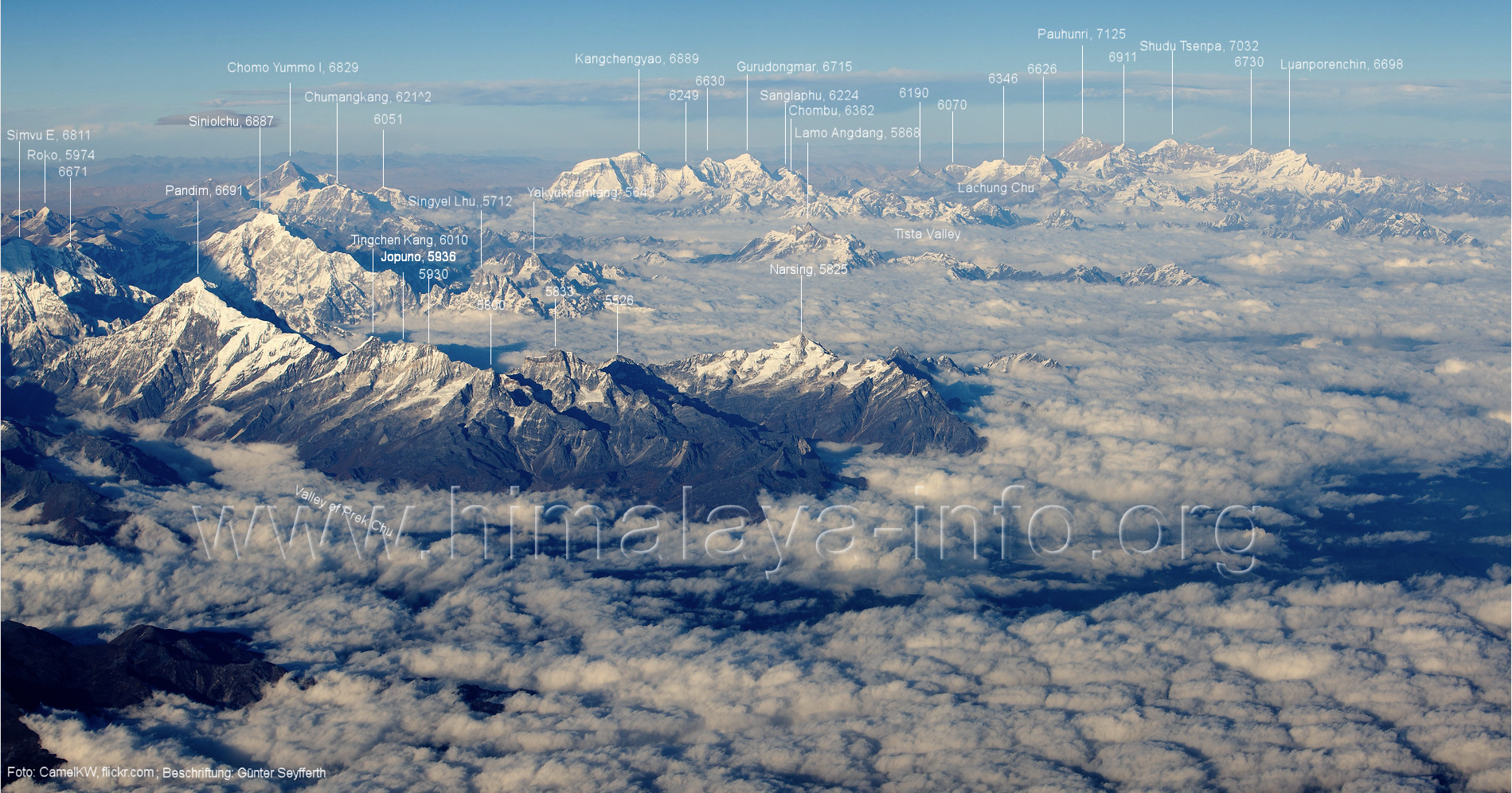 Himalaya auf. Foto: Roger Nix, flickr.com; Beschriftung: Günter Seyfferth (175) Yangma-Gipfel und Kangchenjunga-Massiv von Süden Foto: CamelKW, flickr.com; Beschriftung: Günter Seyfferth Während des Vorbeiflugs "wandert" das Kabru-Massiv in Relation zum Kangenjunga von rechts nach links: (176) Kangchenjuna-Massiv von Süden mit dem vorgelagerten Massiv des Kabru (7412 m) Rechts liegt das Tal des Prek Chu, das den Himalaya-Trekkern als Route zum Pass Goecha La bekannt ist. Foto: unbekannt; Beschriftung: Günter Seyfferth Etwas mehr von den vielen Details lässt das folgenden Foto erkennen: (177) Kangchenjuna-Massiv und Jongsang Peak (7462 m) von Süden mit dem vorgelagerten Massiv des Kabru (7412 m) Foto: Doug Beecroft Photography; Beschriftung: Günter Seyfferth (178) Östlicher Teil des Kangchenjunga-Massiv mit Simvu (6812 m), Pandim (6691 m) und Siniolchu (6887 m) von Süden Im Hintergrund rechts des Kangchenjunga steht die Gipfelkette zwischen Sikkim und Tibet. Foto: CamelKW, flickr.com; Beschriftung: Günter Seyfferth (179) Sikkim - Himalaya von Südwesten Foto: CamelKW, flickr.com; Beschriftung: Günter Seyfferth (179a) Blick von Süd-Südosten zur gesamten Kangchenjunga-Region Die linke Bildhälfte zeigt den nepalesischen Teil der Region, die rechte Bildhälfte den indischen Teil (Sikkim). Foto: Julia Blauhut, Okt.2024; Beschriftung: Günter Seyfferth (180) Pandim (6691 m), Siniolchu (6887 m), Chomo Yummo (6829 m), Kangchenyao (6889 m) und Gurudongmar (6715 m) von Südwesten Foto: CamelKW, flickr.com; Beschriftung: Günter Seyfferth (181) Kangchenyao (6889 m) und Gurudongmar (6715 m) von Südwesten Foto: CamelKW, flickr.com; Beschriftung: Günter Seyfferth (182) Siniolchu (6887 m), Chomo Yummo (6829 m), Kangchenyao (6889 m) und Gurudongmar (6715 m) von Süden Foto: CamelKW, flickr.com; Beschriftung: Günter Seyfferth (183) Pauhunri (7125 m) und Shudu Tsenpa (7032 m) von Südwesten Am Pauhunri wendet sich die von Westen kommende Staatsgrenze zwischen Nepal und China nach Süden. Foto: CamelKW, flickr.com; Beschriftung: Günter Seyfferth (183 a) Blick zu den bergen des östlichen Sikkim mit Chomo Yummo (6829 m), Kangchenyao (6889 m) und Pauhunri (7125 m) Foto: Julia Blauhut, Okt. 2024; Beschriftung: Günter Seyfferth