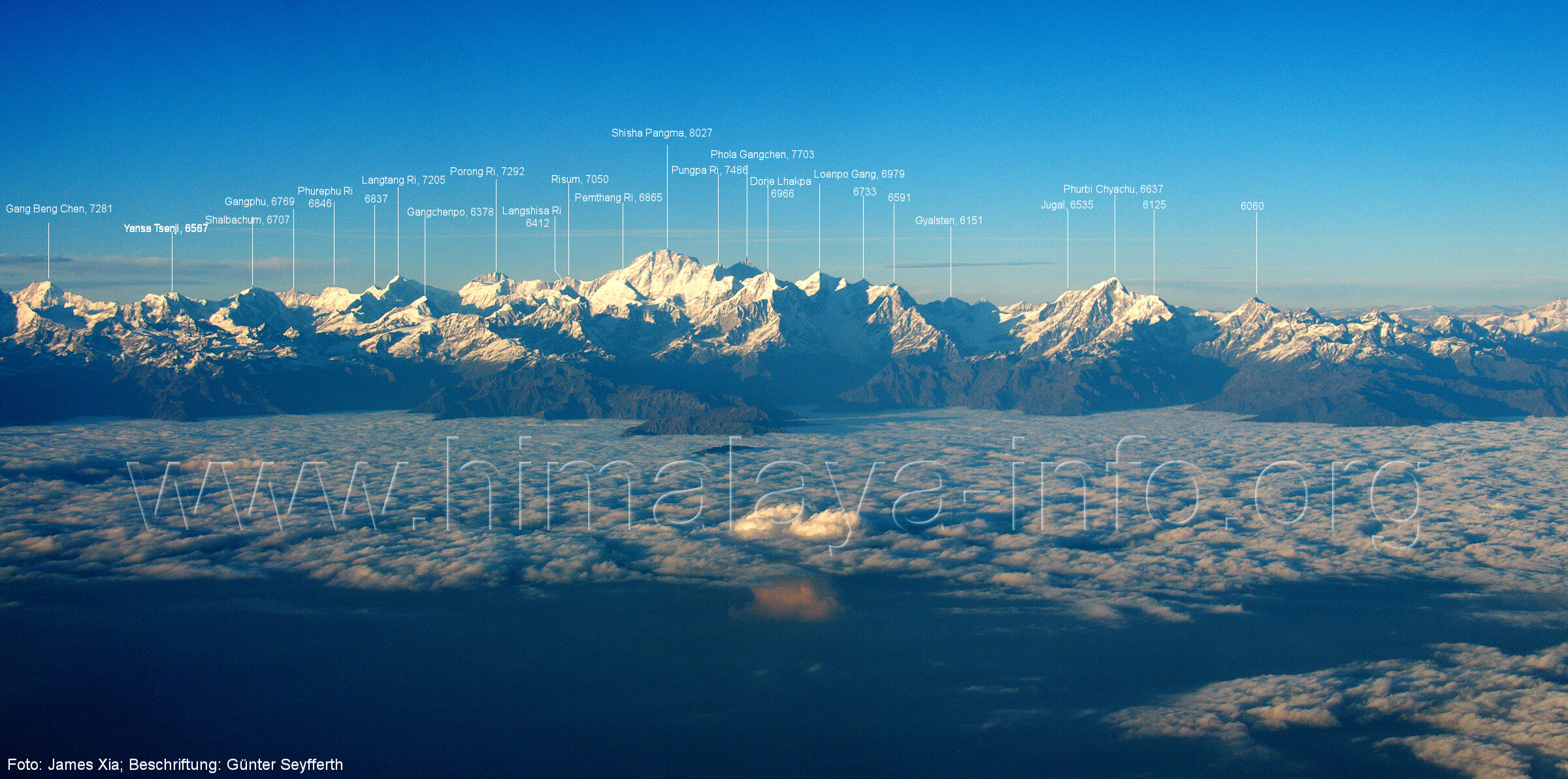 Links der Bildmitte stehen die Berge des Lumba Sumba Himal. Foto: CamelKW, flickr.com; Beschriftung: Günter Seyfferth Das folgende Foto zeigt vorstehende Bildmitte etwas mehr im Detail: (171) Gipfel der Yangma-Region mit dem Lumba Sumba Himal von Südwesten Bild Nr. 151 zeigt die Gipfel der Yangma-Region von der tibetischen Seite. Foto: CamelKW, flickr.com; Beschriftung: Günter Seyfferth (172) Gipfel der Yangma-Region von Süden Foto: CamelKW, flickr.com; Beschriftung: Günter Seyfferth (173) Region des Kangchenjunga (8586 m) von Südwesten