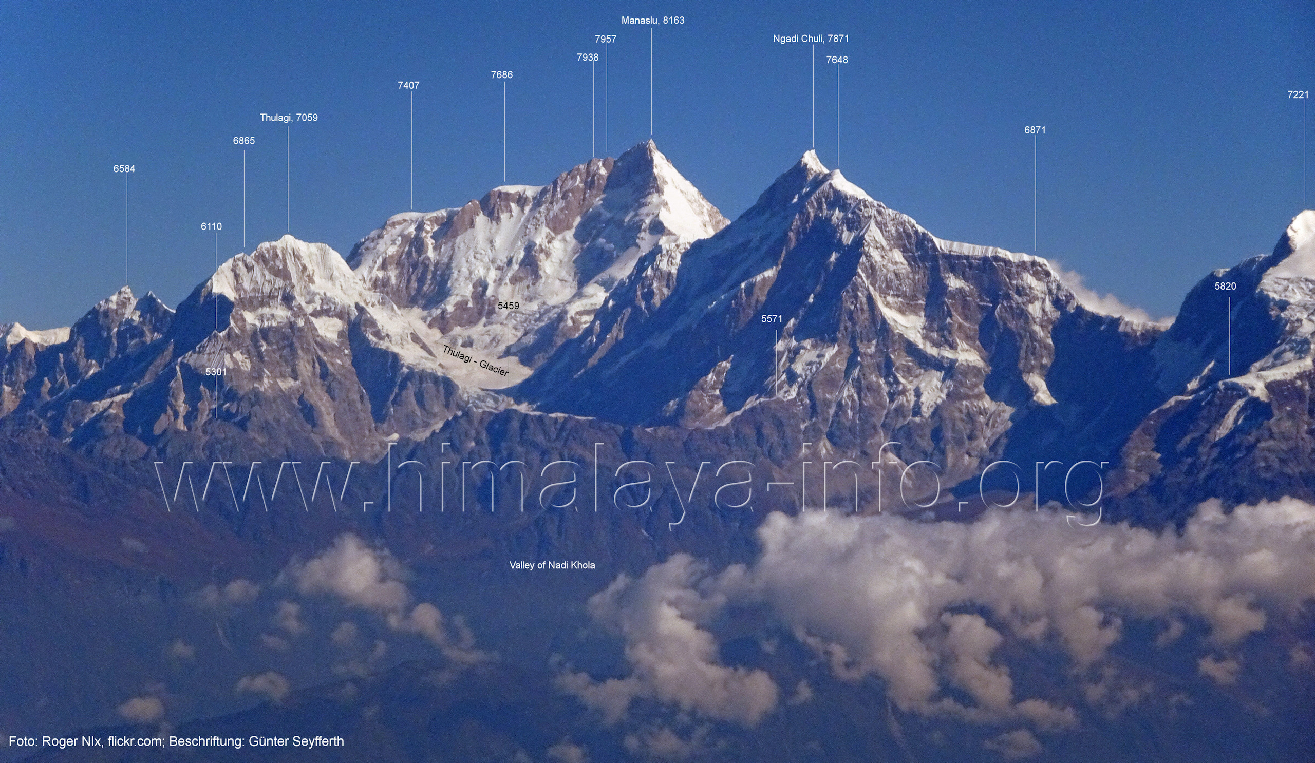 Der Ngadi Chuli ist auch unter dem Namen Peak 29 bekannt. Foto: Wolfgang Schumann; Beschriftung: Günter Seyfferth (49) Manaslu (8163 m) und Ngadi Chuli (7871 m) von Süden Foto: Roger Nix, flickr.com; Beschriftung: Günter Seyfferth (50) Der gesamte Manaslu Himal von Süden Ganz links sind die Siebentausender Nemjung (7140 m) und Himlung (7126 m) des Peri Himal zu sehen. Foto: Roger Nix, flickr.com; Beschriftung: Günter Seyfferth (51) Himal Chuli (7893 m) und Baudha (6672 m) von Süden Foto: Roger Nix, flickr.com; Beschriftung: Günter Seyfferth (52) Peri Himal und Manaslu Himal von Süden