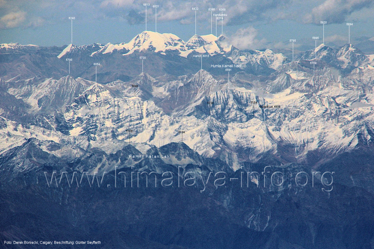 Karkot herum führt der Trek Foto: Derek Boniecki, Calgary; Beschriftung: Günter Seyfferth (17) Gurla Mandhata (7694 m) und Kailash (6714 m) in Tibet und der Saipal (7030 m) im westlichen Nepal aus Richtung Süd-Südost Foto: Derek Boniecki, Calgary; Beschriftung: Günter Seyfferth Luftbilder des Kanjirowa Himal