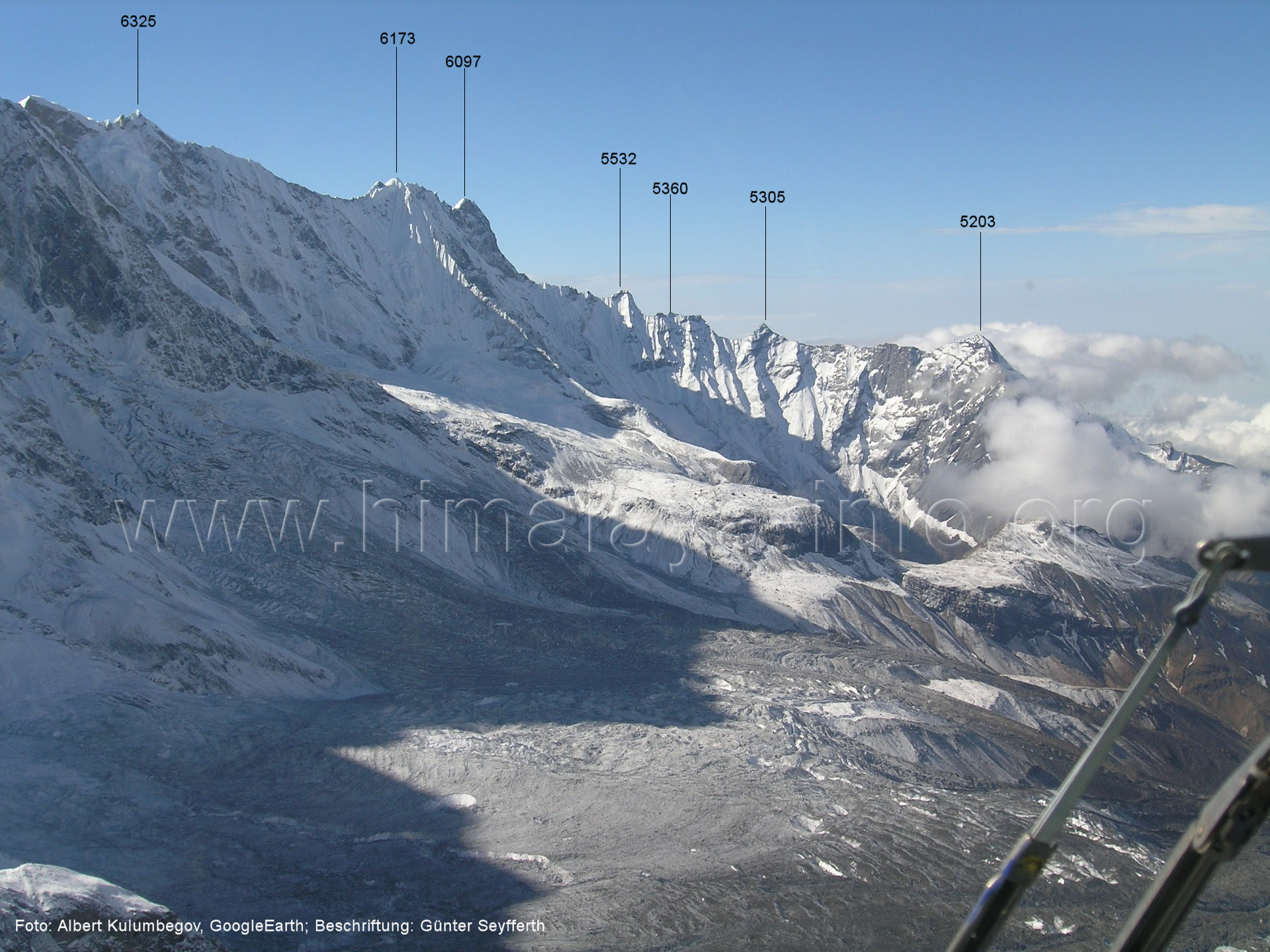Ganz links sind nochmals Wusa (6358 m) und Chalung Ri (6787 m) zu sehen; bitte