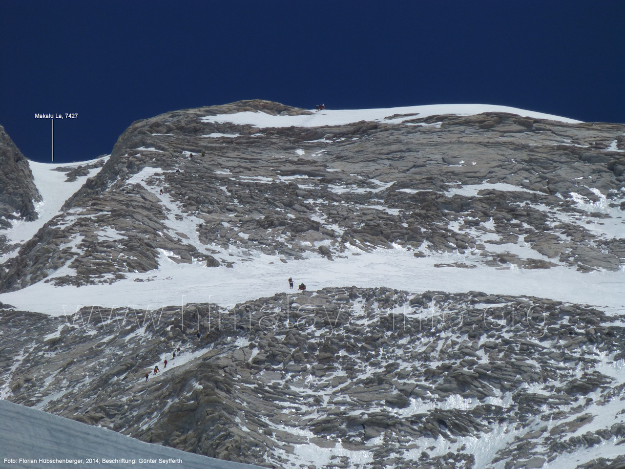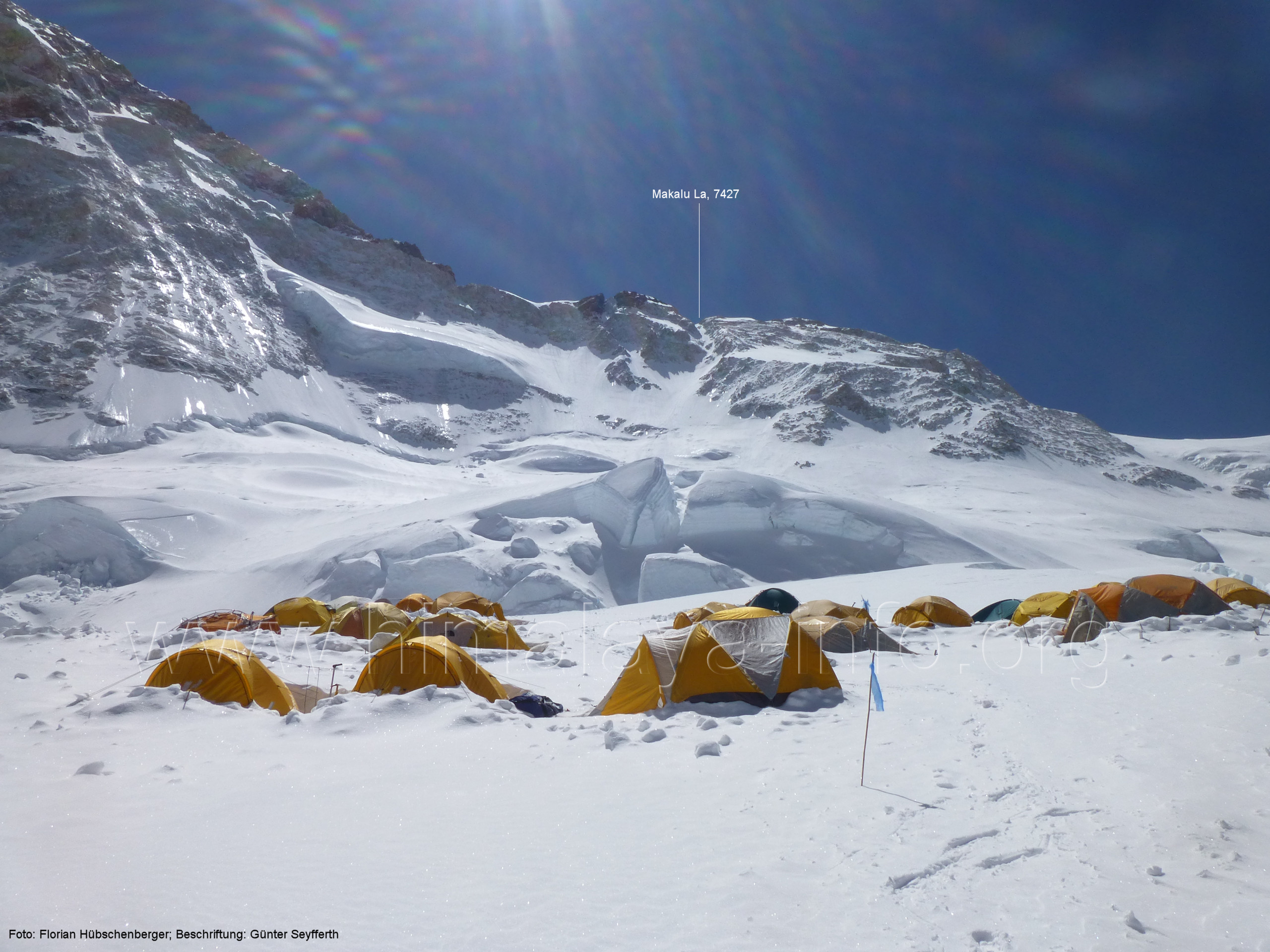 (26) Tiefblick während des Abstiegs unterhalb des Makalu La zum Chago-Gletscher Man erkennt die Zelte des Lagers in ca. 6650 m Höhe. Foto: Florian Hübschenberger; Beschriftung: Günter Seyfferth (27) Blick vom Makalu La (7427 m) nach Westen mit Lhotse (8516 m) und Mount Everest (8848 m) Foto: Toni (nicht mehr online); Beschriftung: Günter Seyfferth (28) Blick vom Makalu La (7427 m) nach Nordwesten mit Lhotse (8516 m), Mount Everest (8848 m), Lhakpa Ri (6986 m) und Khartaphu (7213 m) Foto: Luis Stitzinger & Alix von Melle, 2010; Beschriftung: Günter Seyfferth (29) Blick vom Makalu La (7427 m) nach Süden zum Gipfel (8485 m)