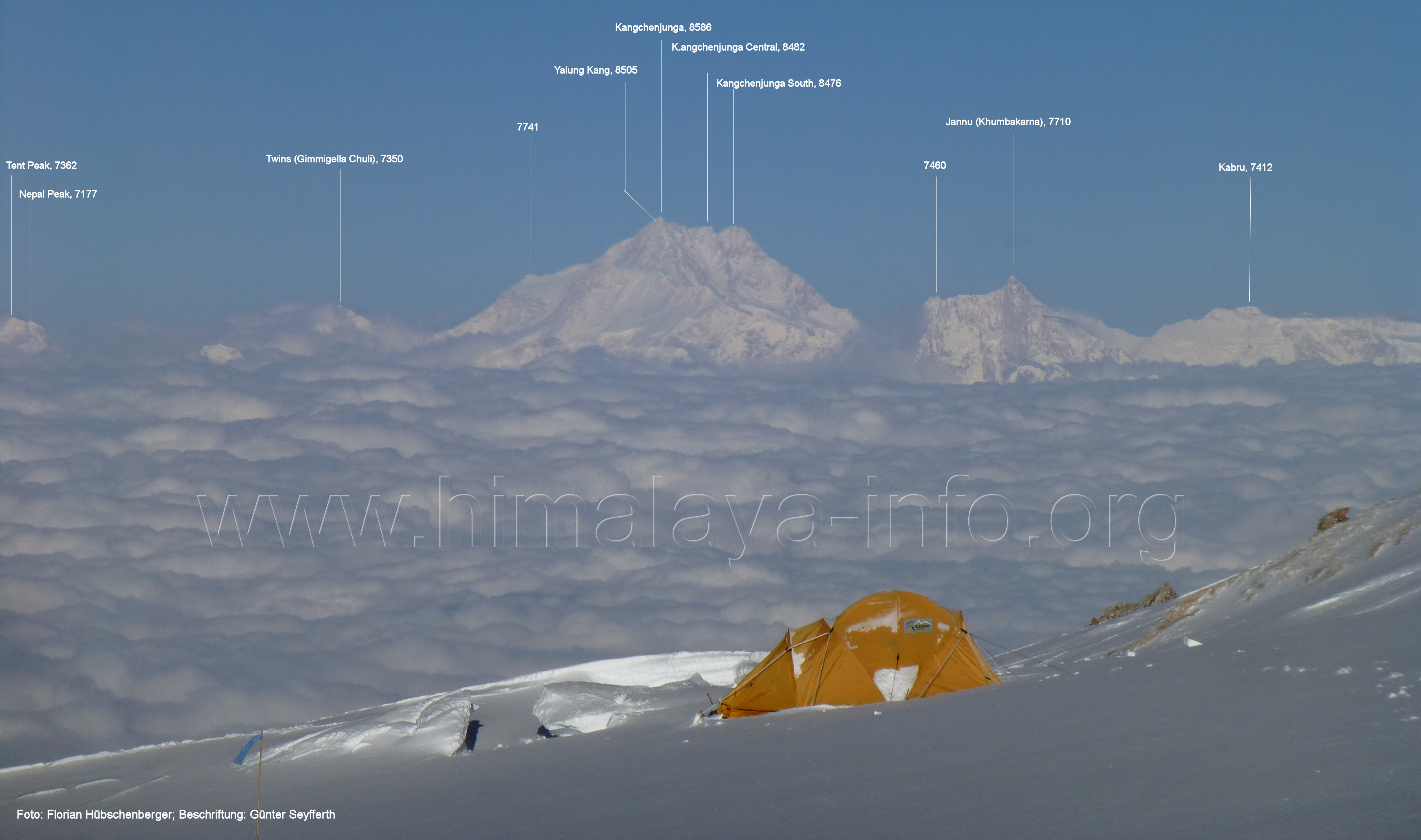 Kangshung-Gletscher; Foto: Florian Hübschenberger, 2014; Beschriftung: Günter Seyfferth Entfernungen zu den Gipfeln: