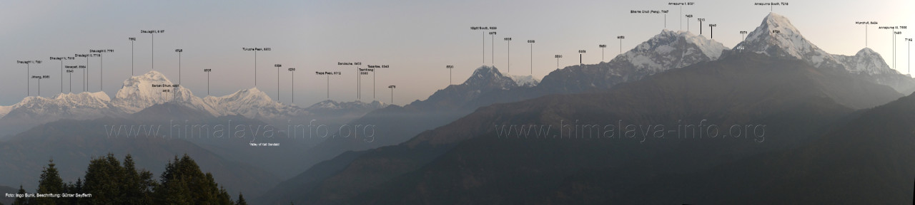 noch sichtbaren Gipfel zu entdecken (siehe auch Bild Nr. 15 und 16). Foto: Everest Journeys ; Beschriftung: Günter Seyfferth(15) Blick von Poon Hill (3185 m) nach Nordosten mit Bharha Chuli (7647 m), Annapurna I (8091 m) und Annapurna South (7219 m) Foto: Andreas' Photos, flickr.com ; Beschriftung: Günter Seyfferth(16) Blick vom Aufstieg zum Poon Hill nach Nord-Nordosten zum Bharha Chuli (7647 m, auch Fang genannt) und zur Annapurna I (8091 m) Foto: Andreas' Photos, flickr.com ; Beschriftung: Günter Seyfferth(17) Blick von Poon Hill (3185 m) bei Sonnenaufgang nach Nordosten zur Annapurna South (7219 m) Foto: unbekannt
