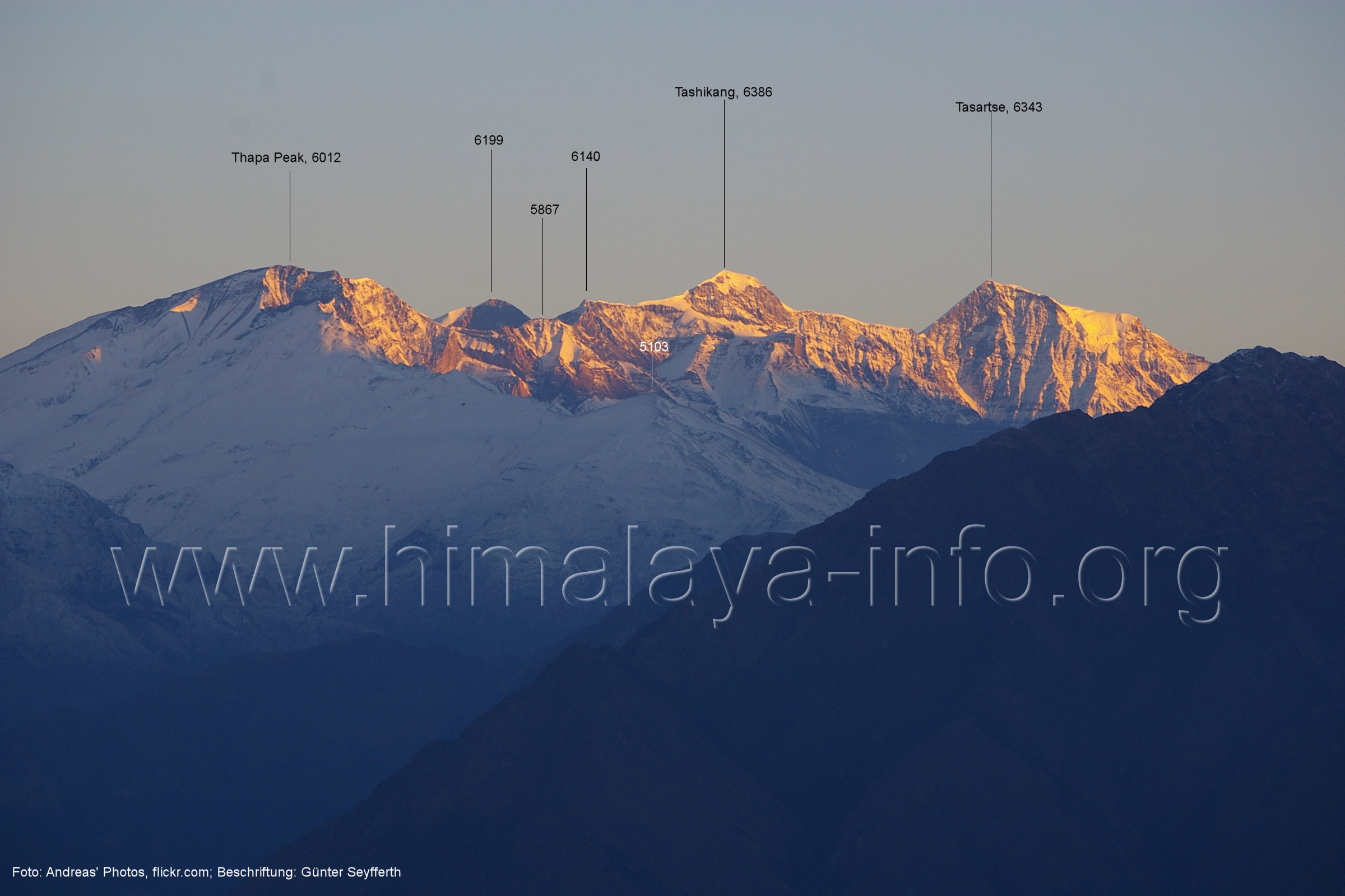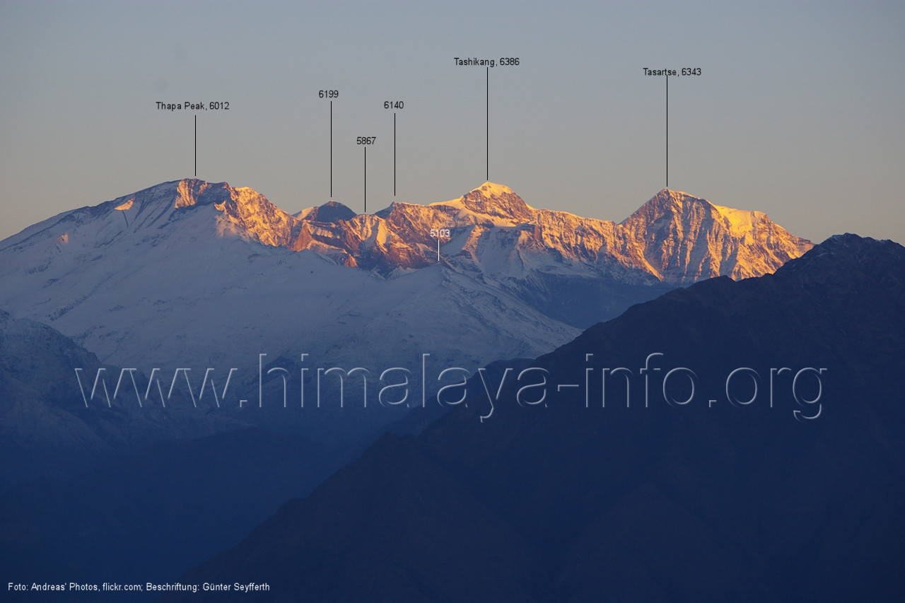 (11) Tele-Blick von Poon Hil (3185 m) nach Norden zum Thapa Peak (6012 m), Tashikang (6386 m) und Tasartse (6343 m)