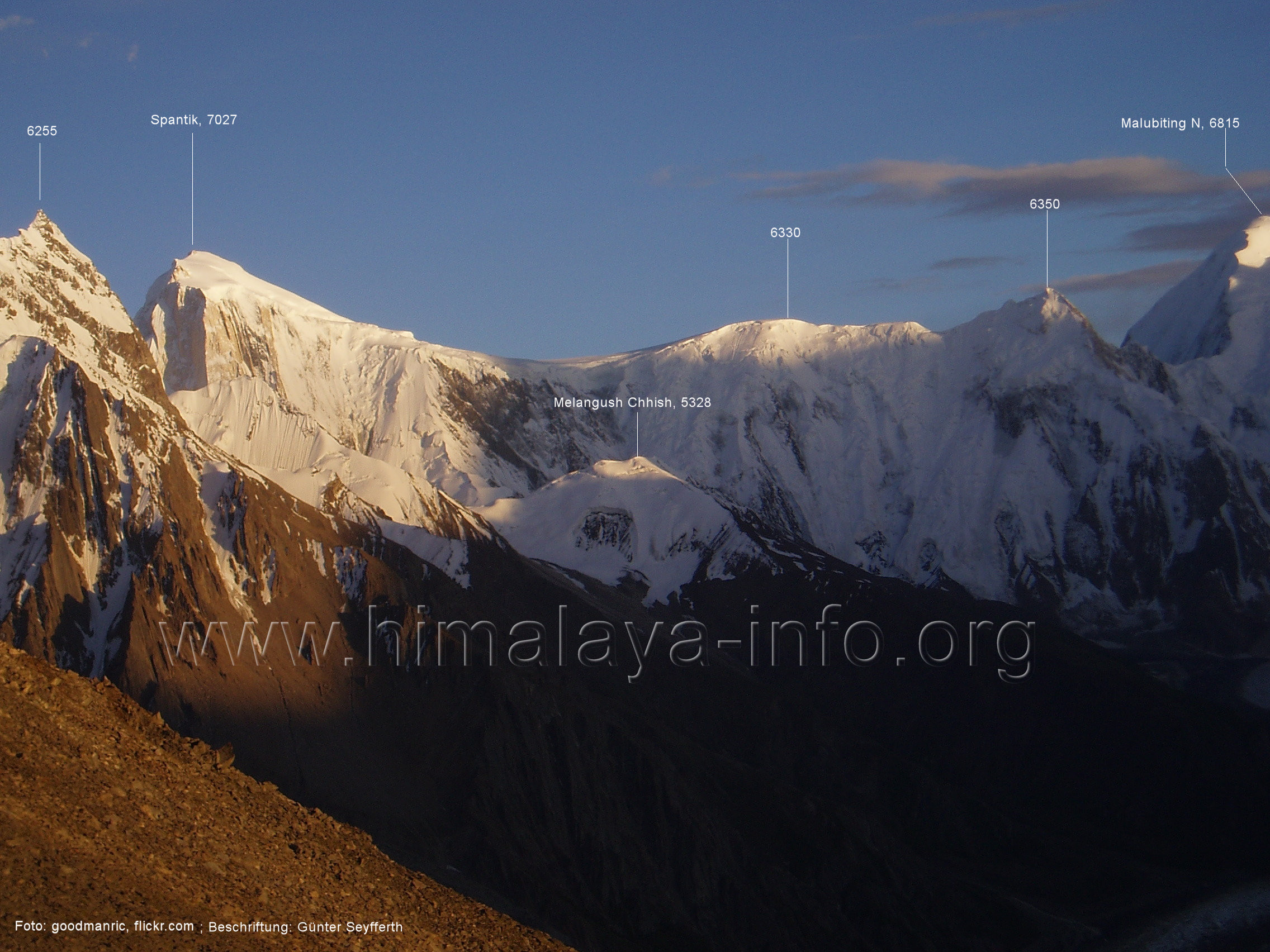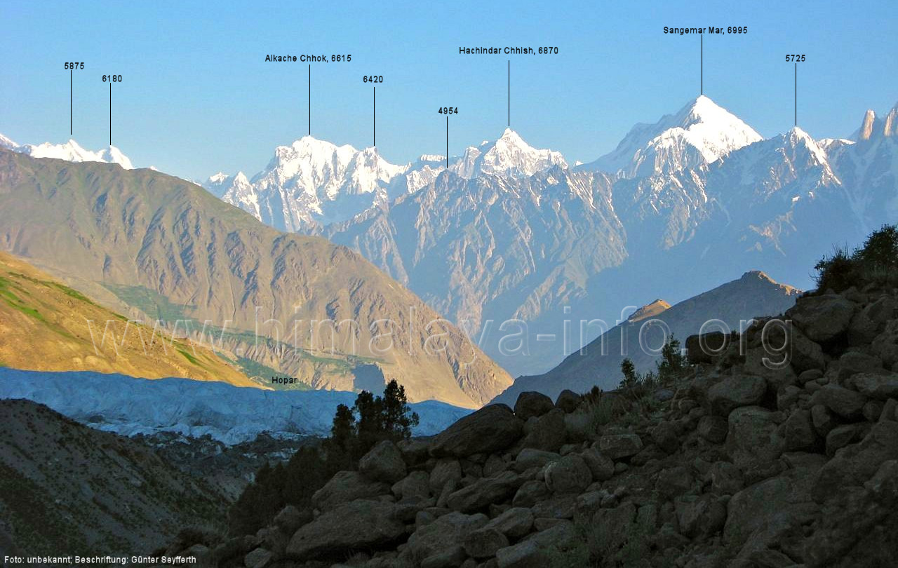 Hispar La (5170 m) Foto: Dr. Sahid Iqbal, flickr.com; Beschriftung: Günter Seyfferth (30) Blick vom Rash Phari (5044 m) nach Osten zum Baintha Brakk (7270 m) und Hucho Alchori (6220 m) Foto: elise and matt, flickr.com; Beschriftung: Günter Seyfferth (31) Blick vom Rash Phari (5044 m) nach Süden zum Malubiting (7453 m), Jut Sar (6800 m) und Miar IV (6620 m) Foto: Dr. Sahid Iqbal, flickr.com; Beschriftung: Günter Seyfferth (32) Blick vom Rash Phari (5044 m) nach Südwesten zu Miar I (6824 m) bis Miar IV (6620 m) Foto: goodmanric, flickr.com; Beschriftung: Günter Seyfferth (33) Blick vom Rash Phari (5044 m) nach Westen zum Diran (7285 m) und Rakaposhi (7788 m) Im langen Ostgrat des Diran erheben sich die Bulche-Gipfel. Foto: Dr. Sahid Iqbal, flickr.com; Beschriftung: Günter Seyfferth Nicht im Gegenlicht des Abends, sondern am Vormittag leuchten die Gipfel in der Sonne:
