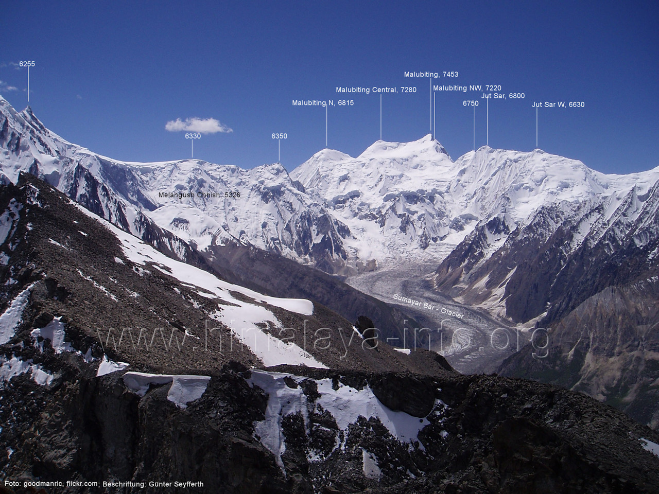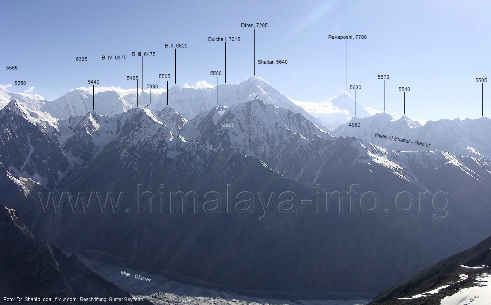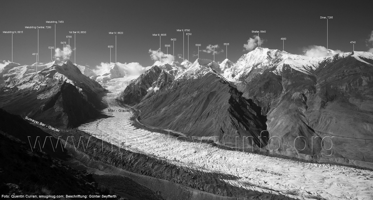 Bualtar-Gletscher hinuntergestiegen ist. Foto: Quentin Curran, smugmug.com; Beschriftung: Günter Seyfferth (3) Blick von der Moräne am Nordrand des Barphu-Gletschers in ca. 2930 m Höhe nach Südosten zum Spantik (7027 m) Der schuttfreie Bereich des Gletschers ist das Eis des Miar-Gletschers nach der Vereinigung mit dem Sumayar Bar-Gletscher. Foto: Quentin Curran, smugmug.com; Beschriftung: Günter Seyfferth