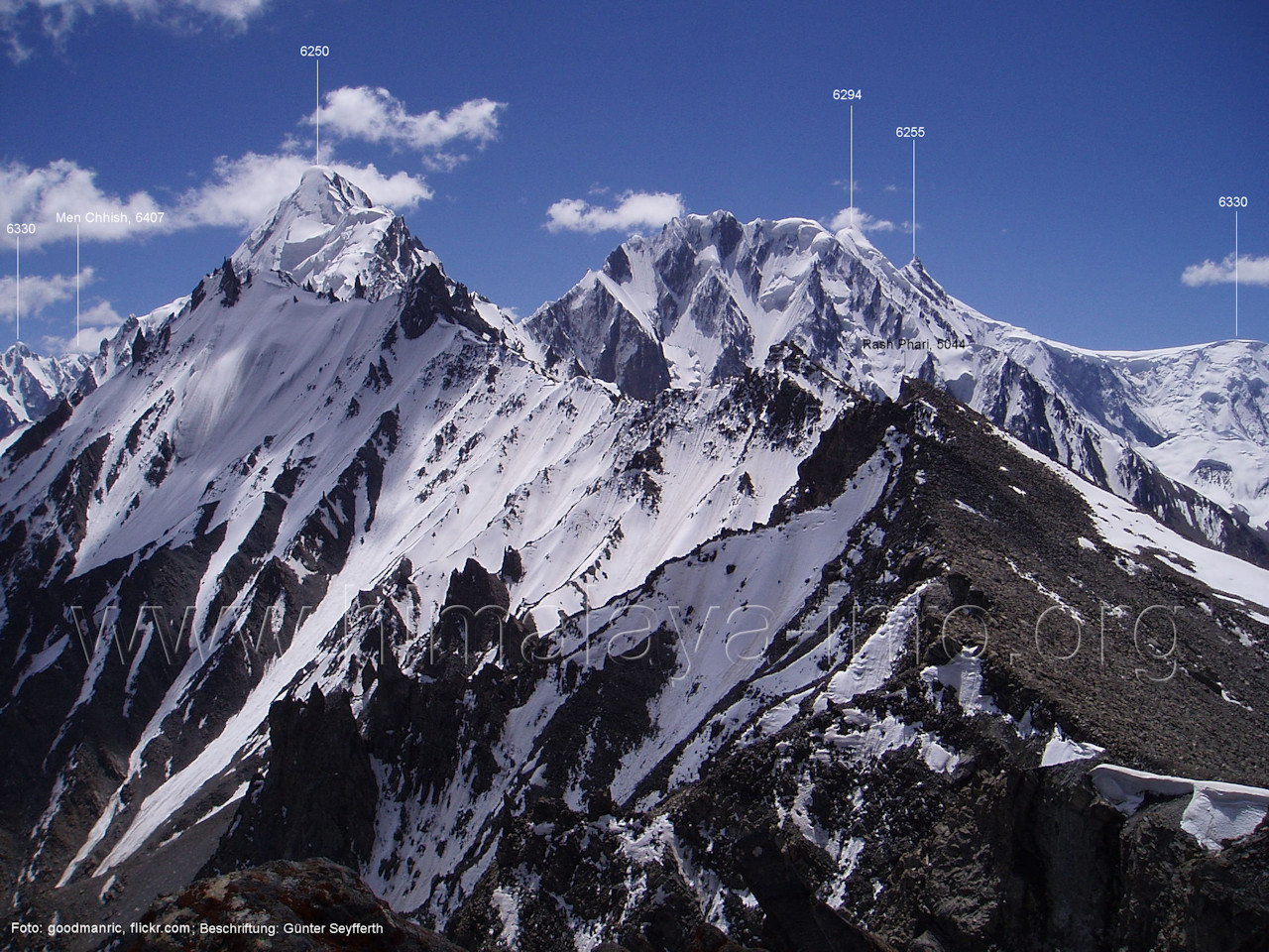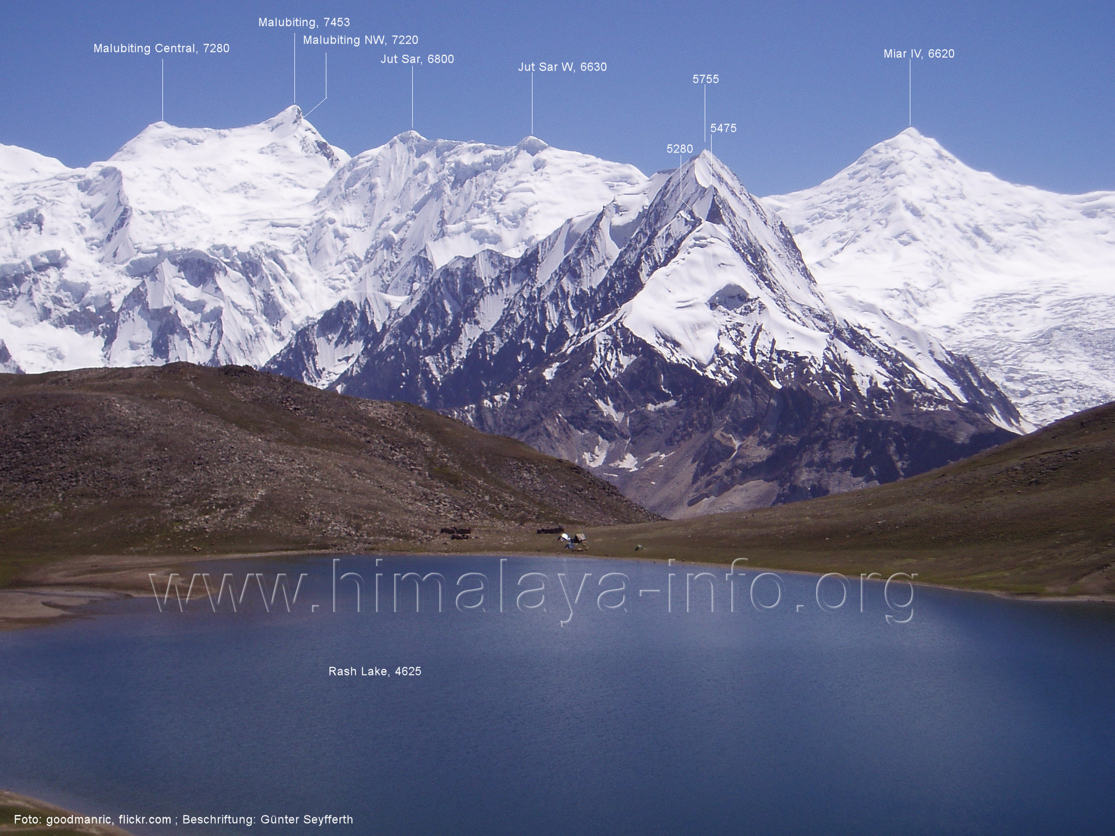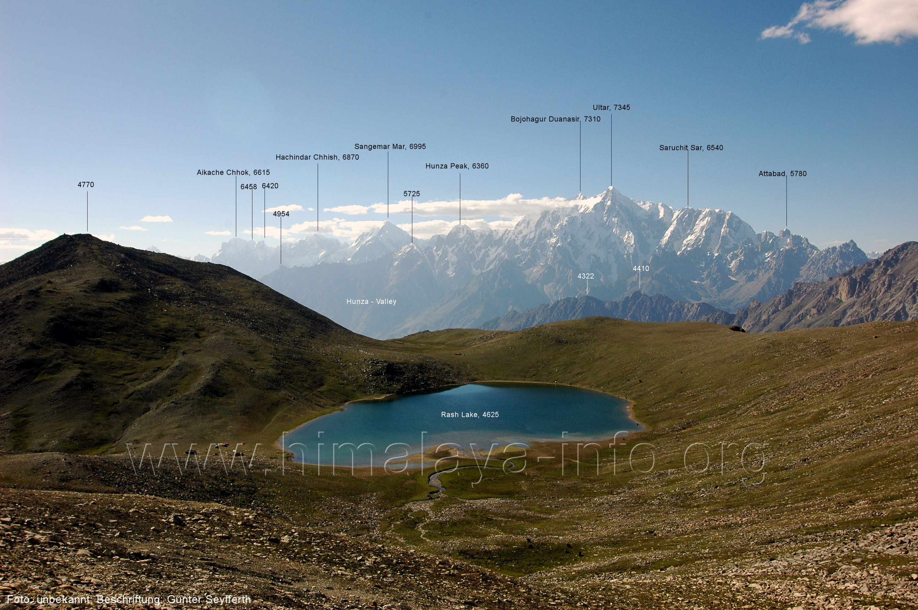 (16) Blick aus der Nähe des Rash Lake nach Nordwesten zum Batura Muztagh Aus dieser Höhe sind von den Gipfel der Hauptkette immerhin nun auch Batura I (7794 m) und Muchu Chiish (7475 m) zu sehen. Foto: Simon101 (nicht mehr online); Beschriftung: Günter Seyfferth (17) Blick vom Rash Lake (4625 m) nach Süd-Südosten zum Peak 6250, Peak 6294 und Spantik (7027 m) Der See liegt in der Mulde links. Foto: goodmanric, flickr.com; Beschriftung: Günter Seyfferth (18) Blick vom Rash Lake (4625 m) nach Süd-Südosten mit Peak 6294, Spantik (7027 m) und Malubiting N (6815 m) Foto: goodmanric, flickr.com; Beschriftung: Günter Seyffert (19) Blick vom Rash Lake (4625 m) nach Süd-Südosten zum Spantik (7027 m) und Malubiting N (6815 m) Foto: goodmanric, flickr.com; Beschriftung: Günter Seyfferth (20) Blick vom Rash Lake (4625 m) nach Süden mit Malubiting (7453 m), Jut Sar (6800 m) und Miar IV (6620 m) Den Bergkamm rechts der Bildmitte mit Peak 5755 war auf Bild Nr. 12 durchs Teleobjektiv zu sehen. Foto: goodmanric, flickr.com; Beschriftung: Günter Seyfferth Der 600-Meter-Aufstieg vom See zum Rash Phari (5044 m) ist - abgesehen von der Höhe - problemlos. (21) Blick vom Aufstieg in ca. 4720 m Höhe zum Rash Phari nach Nordwesten zum Batura Muztagh Batura I und Muchu Chhish (vergl. Bild Nr. 16) verbergen sich in Wolken. Foto: unbekannt; Beschriftung: Günter Seyfferth (22) Kurz vor dem Gipfel des Rash Phari (5044 m, rechts der Bildmitte) zu den Peaks 6250 und 6294 Der Spantik ist vom Rash Phari nicht zu sehen. Foto: goodmanric, flickr.com; Beschriftung: Günter Seyfferth (23) Blick aus ca. 5030 m Höhe nach Süden zum Malubiting (7453 m) und Jut Sar (6800 m) Foto: goodmanric, flickr.com; Beschriftung: Günter Seyfferth Die Bilder vom Gipfel des Rash Phari sind im Uhrzeigersinn geordnet, beginnend im Nord-Nordosten: (24) Blick vom Rash Phari (5044 m) nach Nord-Nordosten zum Lupghar Sar (7230 m) und Momhil Sar (7440 m) Diese Gipfel und die Gipfel der Bilder bis Nr. 27 gehören zum Hispar Muztagh. Foto: goodmanric, flickr.com; Beschriftung: Günter Seyfferth (25) Blick vom Rash Phari (5044 m) nach Nordosten zum Momhil Sar (7440 m), Trivor (7640 m) und Faroling Chhish (6240 m) Foto: goodmanric, flickr.com; Beschriftung: Günter Seyfferth (26) Blick vom Rash Phari (5044 m) zum Faroling Chhish (6240 m) Der Kunyang Chhish (7852 m) am rechten Bildrand ist auf dem folgenden Foto etwas besser zu sehen. Foto: Dr. Sahid Iqbal, flickr.com; Beschriftung: Günter Seyfferth (27) Blick vom Rash Phari (5044 m) nach Ost-Nordosten zum Kunyang Chhish (7852 m), Khani Basa (6510 m) und Hispar Sar (6430 m)